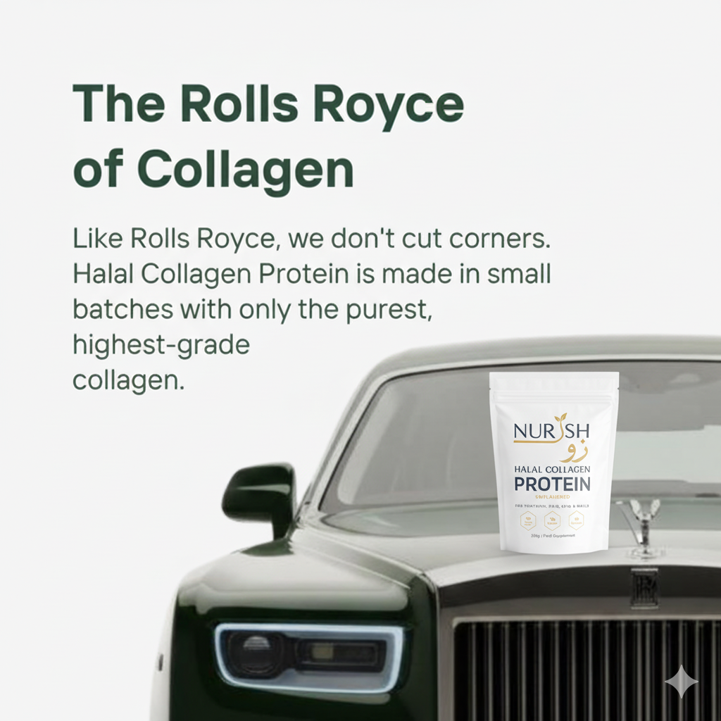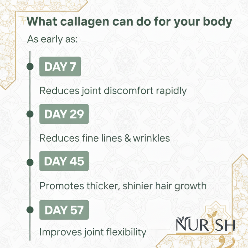 Collagen is one of Allah’s gifts — strengthening our skin, hair, and body in harmony. Nurish Halal Collagen Protein restores what time takes away, bringing back your natural glow and vitality. Sustainably sourced, 100% halal, and crafted with care — a reminder that health is a blessing to be cherished.
